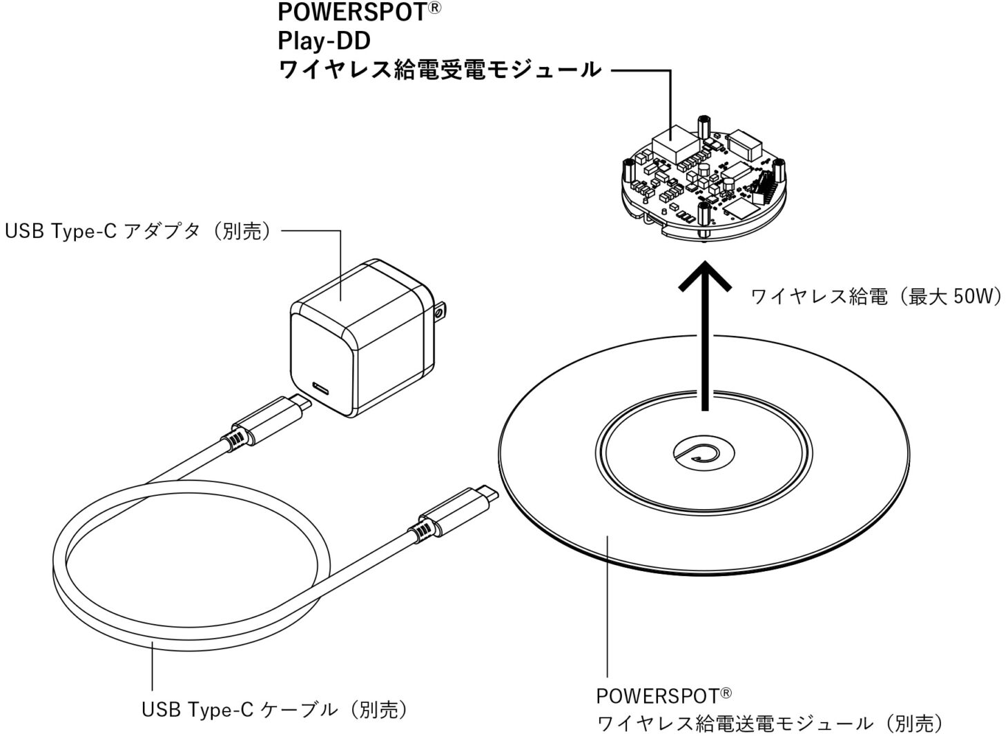 MUGやシリコンボールなどのPOWER SPOT対応製品を開発する為の受電ユニット。最大出力は40W、電圧は5V、12V、15V、20Vから選択可能。